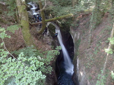 La partie haute est une descente d'initiation par excellence qui conviendra à tous y compris les plus jeunes. Elle se compose de nombreux "petits" obstacles : toboggans, sauts, descente sur corde (rappel), passage de grotte, tyrolienne, le tout encaissé entre deux parois travaillées par l'eau, pour le plus grand plaisir des yeux. Les plus courageux ne s'y ennuieront pas pour autant puisque presque tous les obstacles peuvent être franchis en sautant (jusqu'à 9 mètres de haut) ; un bon challenge en perspective ! Les sauts sont à l'appreciation du moniteur.