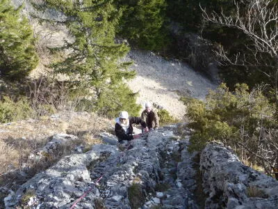 Jeunes enfants de 6 à 8 ans La découverte de la verticalité se fera sur un itinéraire de plusieurs longueurs peu raides "Les Petits Piliers" pour appréhender le rocher tout en douceur sans contraintes techniques. Ensuite, suivant les capacités de chacun, on apprendra à descendre sur une falaise plus ou moins haute, en rappel ou en moulinette.