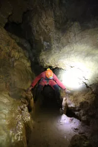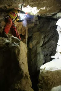 Pour la suite, possiblité d'aller à la salle suspendue par l'intermédiaire de passages d'escalade puis une redescente sur corde en rappel de 20m du bout du méandre en son pied. La remontée en escalade facile se fait par un puit de 15m qui permet de déboucher au pied du ressaut d'entrée de 6m.
